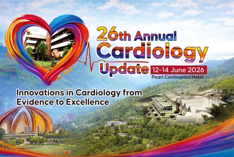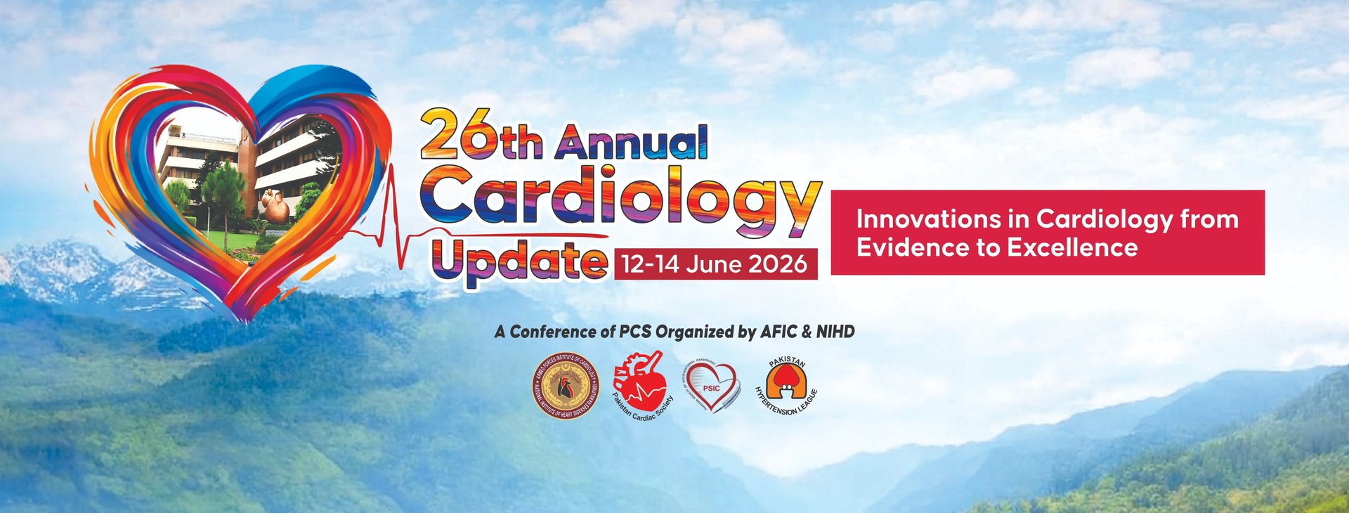 IWe are pleased to invite you to participate in the 26th Annual Cardiology Update, scheduled 12th to 14th June 2026, in Pearl Continental Hotel, Bhurban. The conference is being organized by AFIC & NIHD, Rawalpindi on behalf of Pakistan Cardiac Society. The theme of the conference is “Innovations in Cardiology from Evidence to Excellence”.